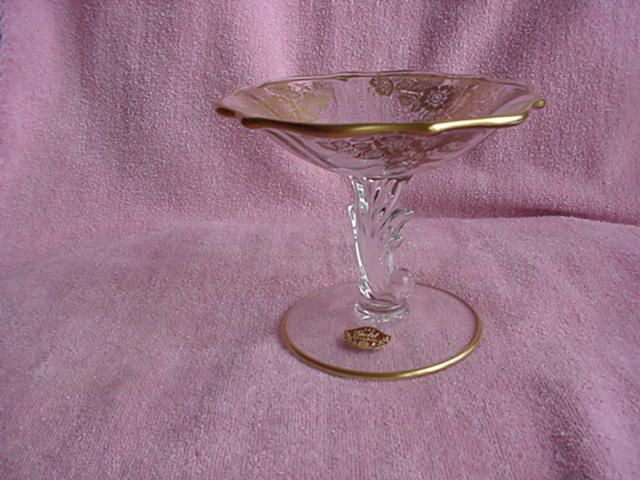 This small pedestal dish has the 22 carat gold overlay label from Silver City Glass Company on