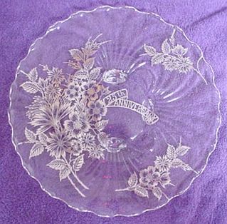 The anniversary logo is identical to other known pattern pieces produced by the Silver City Glass Company. Springtime seems very typical of the other patterns due to the daintiness and place-ment of the designs on the glass dishes. In fact, several different designs adorn these same plates. This plate has 4 small feet and measures 14" in diameter. |